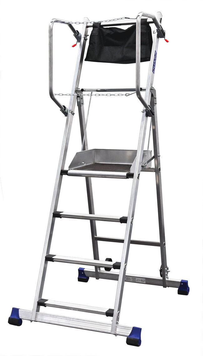 Hauteur de travail : 2,90 m. Plancher antidérapant (0,50 x 0,40 m) avec plinthes intégrées, mise en place et rangement instantanés.
